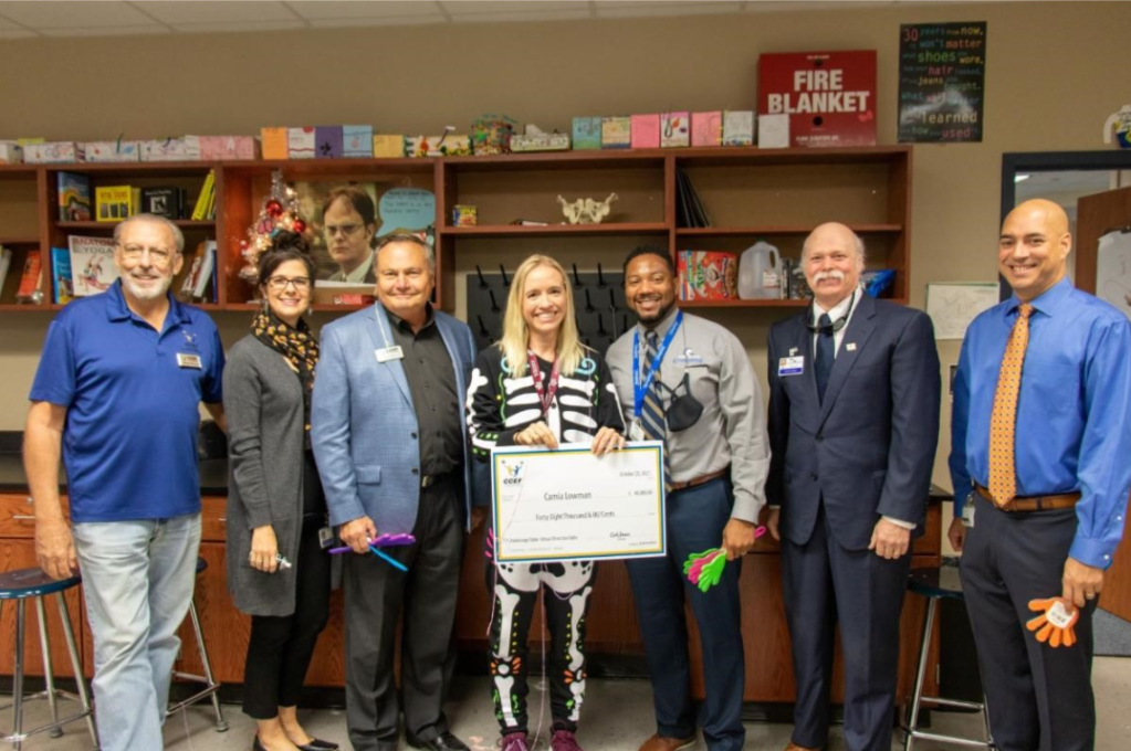 [Pictured Above] In October 2021, I was awarded a $48k grant from the Clear Creek Education Foundation to purchase an Anatomage virtual dissection table. I was dressed like a skeleton the day they surprised me.